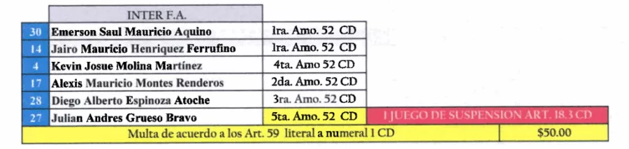 Mientras que Inter FA recibió una multa de $50.00
