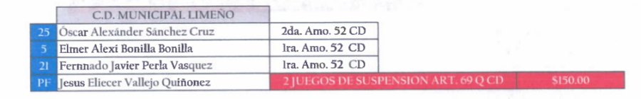 El preparador físico de Municipal Limeño, Jesús Vallejo, fue expulsado en el encuentro ante CD Platense, recibiendo una suspensión de dos encuentros.