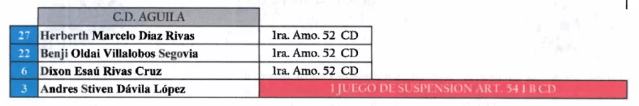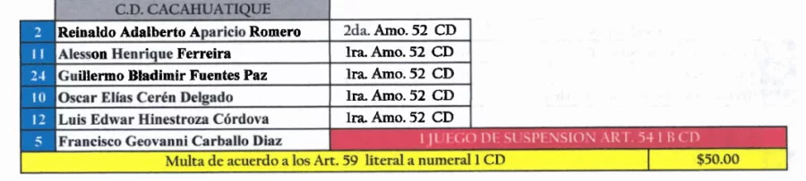 Por su parte, Francisco Carballo de CD Cacahuatique también recibió un partido de sanción por su expulsión ante Alianza FC.