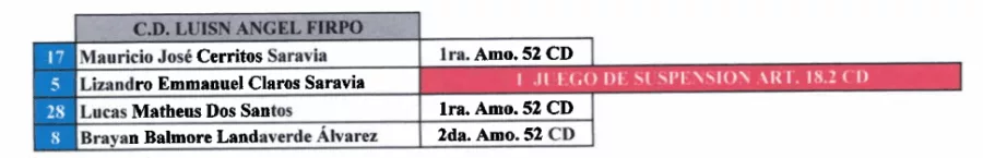 La Comisión Disciplinaria de la Federación Salvadoreña de Fútbol (FESFUT) dio a conocer el listado de jugadores sancionados para la gran final del Torneo Apertura 2025.
