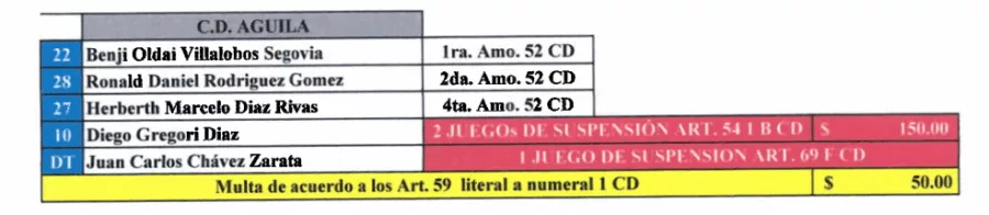 En CD Águila, Gregori Díaz recibió dos juegos de sanción por su expulsión ante Luis Ángel Firpo por lo que se perderá el arranque del Clausura 2026. Además de una multa de $150.00