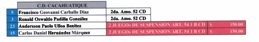 Finalmente, Paolo Ulloa y Daniel Márquez de CD Cacahuatique recibieron dos juegos de sanción y una multa de $150 cada uno.