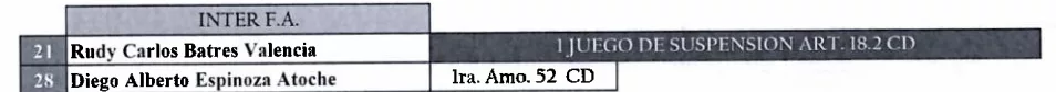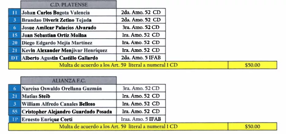 Finalmente, Inter FA y Metapán recibieron una multa de $50.00 por tener cinco jugadores amonestados en sus últimos compromisos.