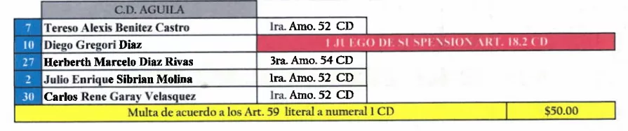Por su parte, Gregori Díaz de CD Águila también recibió un partido de sanción por su expulsión ante Fuerte San Francisco.