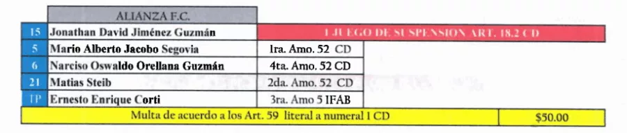Mientras que, Jonathan Jiménez también se perderá un encuentro tras su expulsión en el partido ante Isidro Metapán. Alianza deberá pagar una multa de $50.00