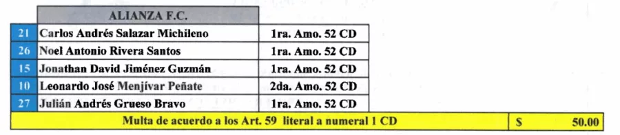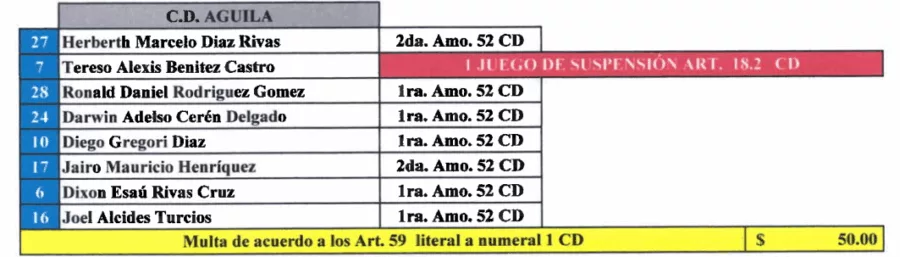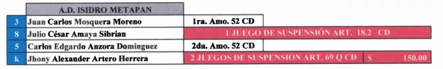 Julio Amaya de Isidro Metapán recibió un juego de sanción. Mientras que, el kinesiólogo Jhony Artero recibió dos juegos de suspensión y una multa de $150.00. Por lo que se perderán el arranque del Torneo Clausura 2026.