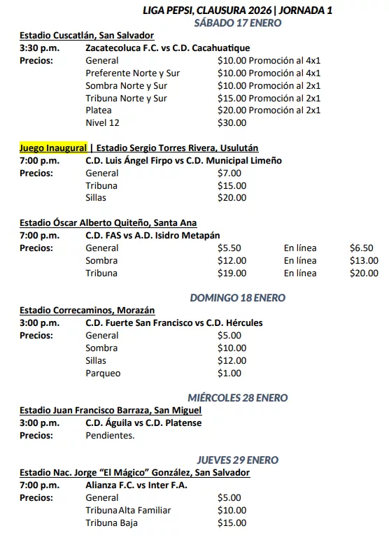 En duelos reprogramados, el miércoles 28 de enero, CD Águila se enfrentará a CD Platense en el estadio Juan Francisco Barraza de San Miguel a las 3 de la tarde.