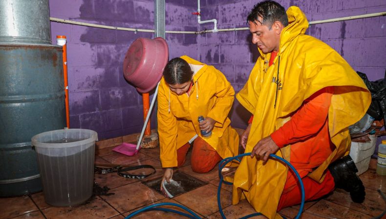 Elementos de Cuerpo de Bomberos atendieron la inundación en una vivienda ubicada en la residencial, Bosques de La Paz, Ilopango. El equipo operativo realizó las acciones de limpieza y retiro del agua acumulada en la vivienda.