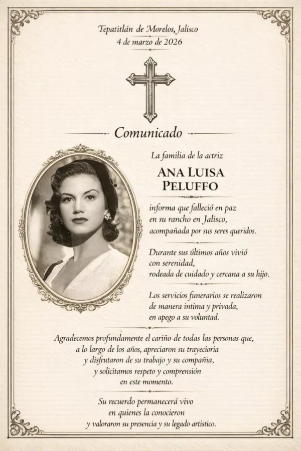 De acuerdo con el mensaje difundido por sus familiares, la actriz murió en paz en su rancho ubicado en Tepatitlán de Morelos, en el estado de Jalisco, acompañada por sus seres queridos. “Falleció en paz, en su rancho en Tepatitlán de Morelos, Jalisco, acompañada por sus seres queridos”, señala el comunicado compartido por la familia.