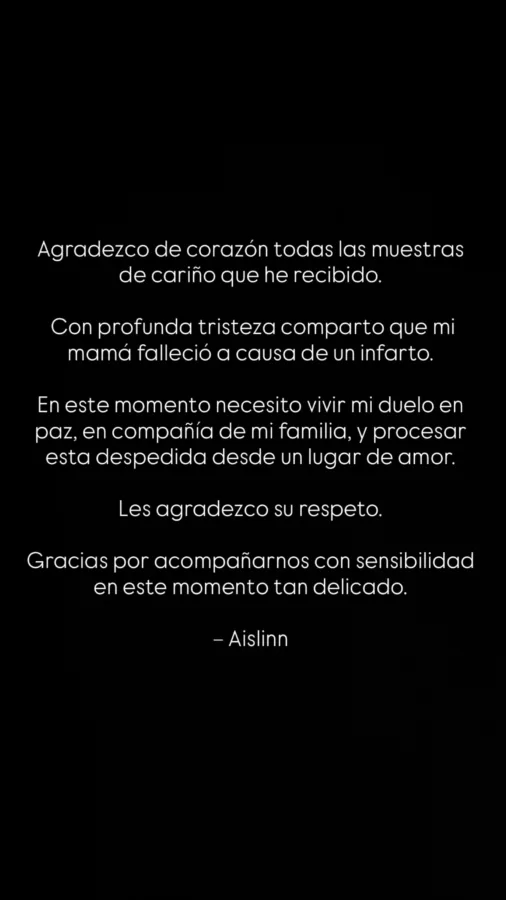 “Agradezco de corazón las muestras de cariño que he recibido”. Luego, aclaró la causa del fallecimiento: “Con profunda tristeza comparto que mi mamá falleció a causa de un infarto”, escribió Aislinn en su cuenta de Instagram.