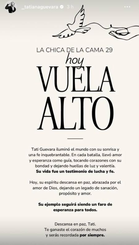 “Tati Guevara iluminó el mundo con su sonrisa y una fe inquebrantable. En cada batalla, llevó amor y esperanza como guía, tocando corazones con su bondad y dejando huellas de luz y valentía”, dicen las primeras palabras del texto publicado en redes.