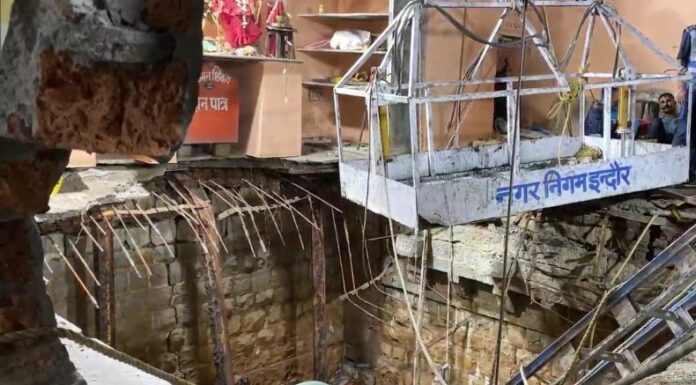 Docenas de personas cayeron en un pozo, tras derrumbarse una estructura construida en el complejo del templo hindú, en Indore, estado de Madhya Pradesh, India.