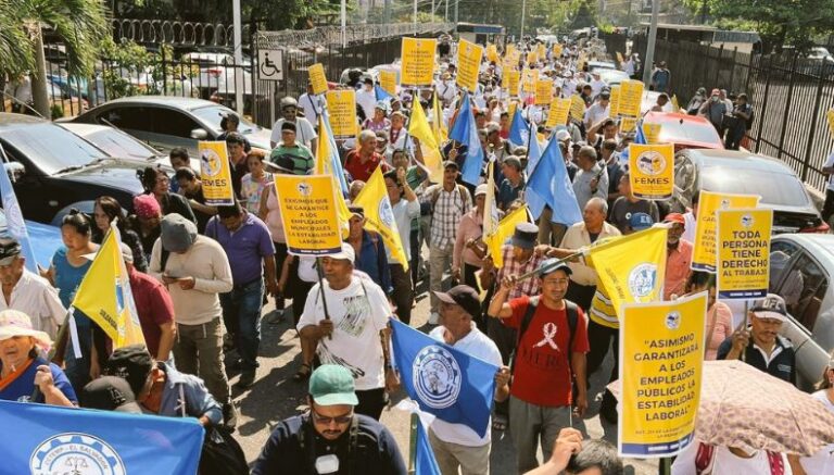 Esta mañana, la Federación de Empleados Municipales de El Salvador (Femes) realizó una marcha en solitud a que garantice la estabilidad laboral de los trabajadores municipales.