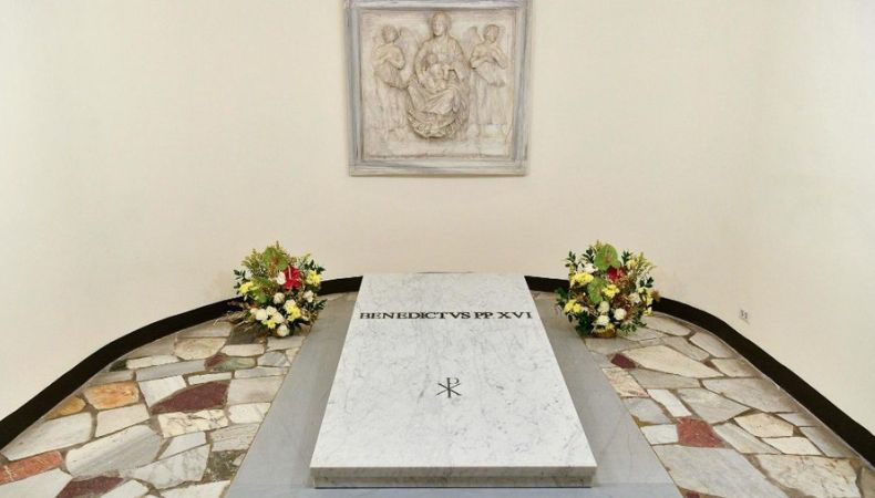 Tumba en la que reposan los restos físicos de Benedicto XVI/ Imagen de carácter ilustrativo no comercial/ Link: https://www.vaticannews.va/es/vaticano/news/2023-01/benedicto-xvi-fieles-en-oracion-ante-su-tumba-en-las-grutas-vati.html