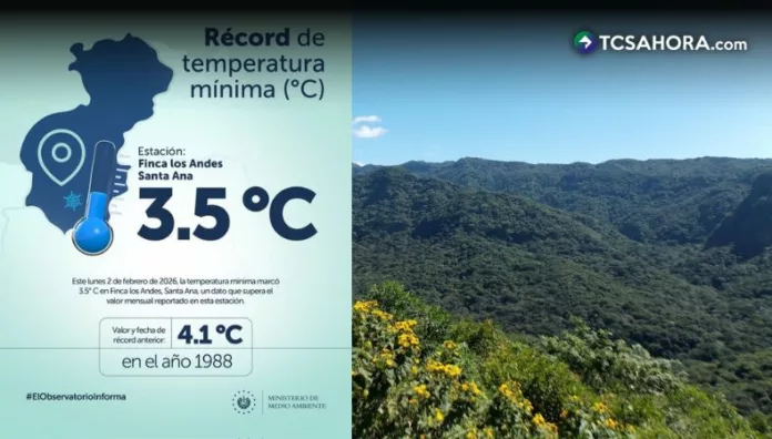 La estación meteorológica de Finca Los Andes, en Santa Ana, registró esta lunes un nuevo récord histórico de temperatura mínima de 3.5 °C, informó el Ministerio de Medio Ambiente y Recursos Naturales (MARN). Con esta cifra, la temperatura descendió por debajo del récord anterior de 4.1 °C, registrado en 1988.
