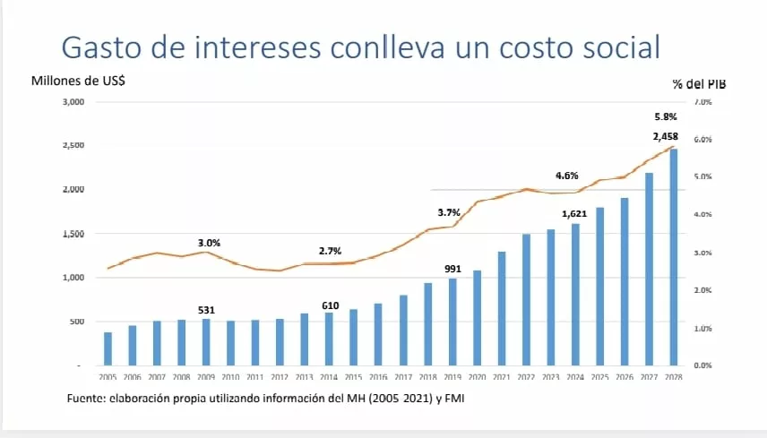 “Desde el 2012 hacia atrás anduvo cerca de $531 millones; incluso, antes fue menor de $500 millones y respecto al PIB eran tres puntos, más o menos. Ya cuando termina (Mauricio Funes) eran $610 millones (2.7 PIB). Esos años del Frente (FMLN) empezó a subir la deuda con ellos y empezó a subir los intereses, a tal punto que, en 2019, ya se había duplicado el gasto de intereses: de $530 millones a $931 millones y a niveles de 3.7 del PIB. Cayó la pandemia y empezó a subir la deuda fuertemente y también los gastos de interés. Y ya para 2024 era de $1,621 millones (del año 2022, los datos son del FMI). Ellos estiman que el año 2027 o 2028, llegará a $2,400 millones en gasto de intereses, el PIB llega a 5.8”, sostuvo Lemus.