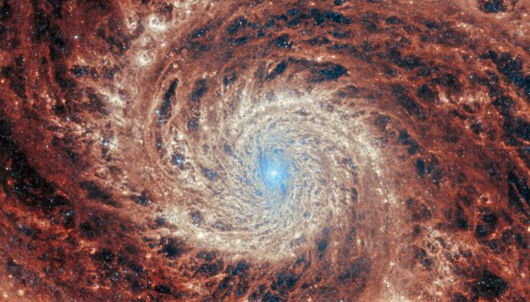 Esta imagen fue captada por el instrumento de infrarrojo medio del telescopio, llamado MIRI. Este se enfocó en la estructura en forma de red de polvo de la galaxia, que parece dibujar un vórtice, en cuyo final se halla el gas ionizado de cúmulos estelares recién formados. En la imagen, esto representa el punto azul lejano.