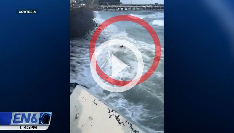 Una pareja casi es arrastrada en el Puerto de La Libertad, debido al fuerte oleaje provocado por corrientes de retorno.