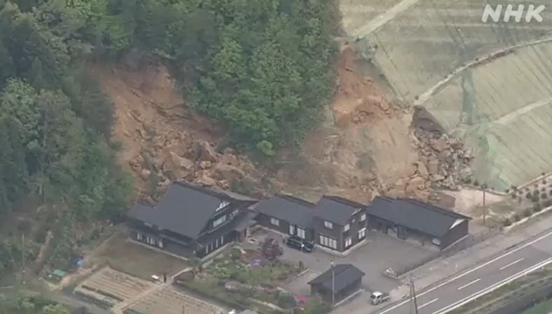 Imágenes de la cadena nacional NHK, muestran casas tradicionales japonesas de madera destruidas o inclinadas, con ventanas rotas y tejados dañados. En tomas aéreas, se puede ver la ladera de una montaña derrumbada.