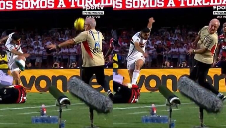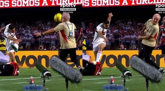 La jugada accidentada ocurrió en el tramo final del choque. En su afán de frenar una llegada rival, el ariete del equipo paulista Michel Araújo despejó el esférico de manera violenta, pero el uruguayo no se percató lo cercano que estaba de su estratega, Dorival Júnior, quien recibió el fuerte impacto de la número 5 en su rostro.