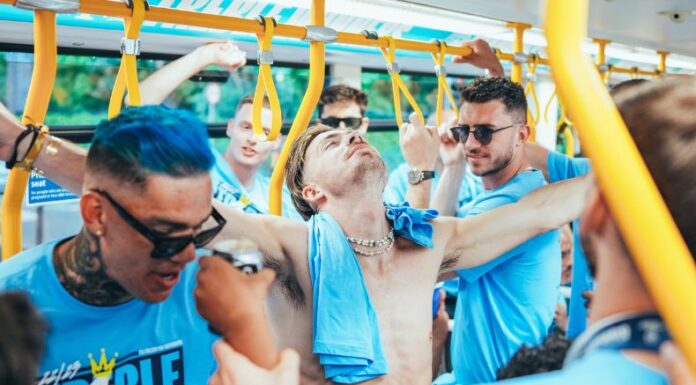 Toda la plantilla se subió a un autobús descapotable y recorrió las calles de Tonman St hasta Princess St. Allí recibieron todos los elogios de los aficionados Skyblues que salieron de sus casas para presenciar el recorrido en caravana de primera mano.