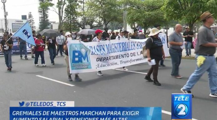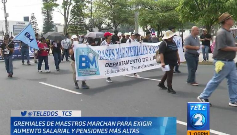 Esta tarde, de la Plaza Divino Salvador del Mundo, unas gremiales de sindicatos de maestros marcharon hacia Casa Presidencial (Capres), pidiendo el incremento de las pensiones para el sector, y la revisión del aumento salarial a los profesores, que según la Ley de la Carrera Docente, debe evaluarse cada tres años.