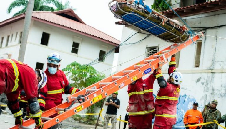 Miembros de rescate del grupo USAR El Salvador participan en el tercer simulacro regional de respuesta y asistencia humanitaria de un terremoto magnitud 7.5 de magnitud en la escala de Richter, que se origina en la falla de Pedro Miguel en la ciudad de Panamá.