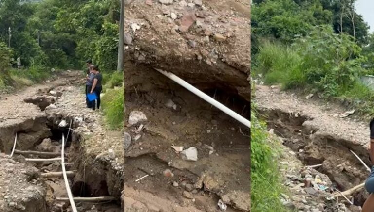 Uno de los tramos más críticos es una zona donde la calle colapsó por completo, formando una zanja profunda que representa una amenaza para toda la población, especialmente durante la temporada de lluvias.
