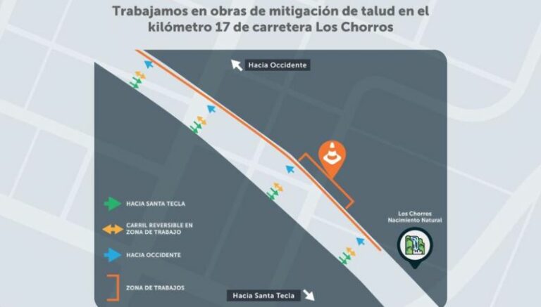Desde el pasado 29 de abril, FOVIAL anunció las obras de mitigación en la carretera Los Chorros. De acuerdo con la institución, las obras de mitigación se desarrollan en el kilómetro 16.5, en el sentido hacia el occidente del país, a la altura del tramo conocido como ex báscula.