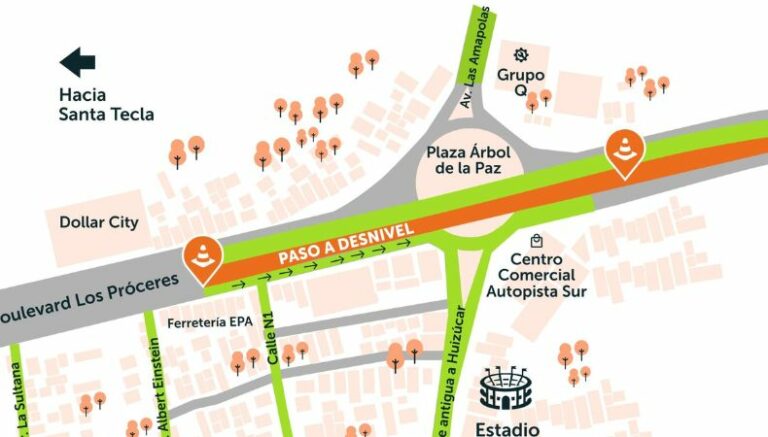 El Fondo de Conservación Vial (FOVIAL) informó que, durante este fin de semana, el tránsito estará restringido en el paso a desnivel del Árbol de La Paz, San Salvador. Dicha medida se debe a obras de mantenimiento en el sector.