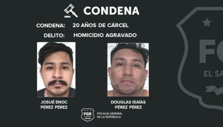 Por medio de X, la FGR informó que dos hermanos están condenados a 20 años de prisión por el delito de homicidio agravado. Se trata de Josué Enoc y Douglas Isaías Pérez Pérez, quienes asesinaron a una persona en Santiago Texacuangos, de San Salvador Sur.