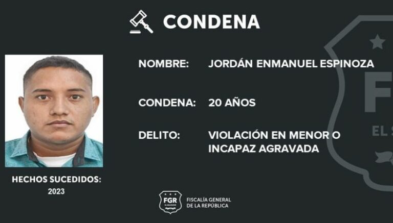 Por medio de la cuenta de X, la FGR informó la condena de un hombre que pasará 20 años de prisión por abusar de forma sexual a una menor de edad. Se trata de Jordán Enmanuel Espinoza, sentenciado por el delito de violación en menor o incapaz agravada. Esto por sucesos ocurridos en 2023.