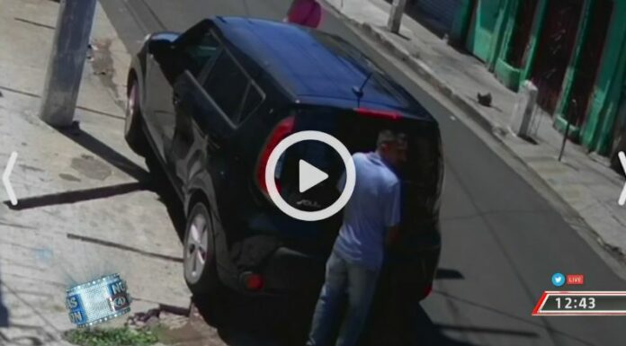 Una cámara de seguridad en la 4.ª calle Poniente, en San Salvador, captó el momento en que un sujeto se acerca a uno de los vehículos estacionados en la vía, y simula orinar encima de la parte trasera del mismo.