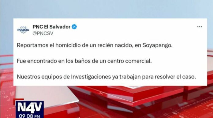 A través de la cuenta X escribió: «Reportamos el homicidio de un recién nacido en Soyapango. Fue encontrado en los baños de un centro comercial».