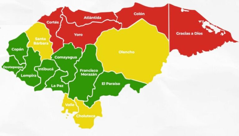 Además, hay cuatro departamentos con alerta amarilla: Olancho y Santa Barbara, Choloteca y Valle y para el resto del país hondureño se tiene alerta verde.
