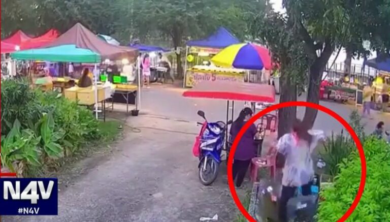 En el video se observa que la mujer estaba tranquila moviendo objetos del negocio, luego se acercó a una zona donde tenía sus cosas. Posterior a ello, puso un pie sobre la tapadera del desagüe y otro en la grama, mientras se dispuso a levantar algo.