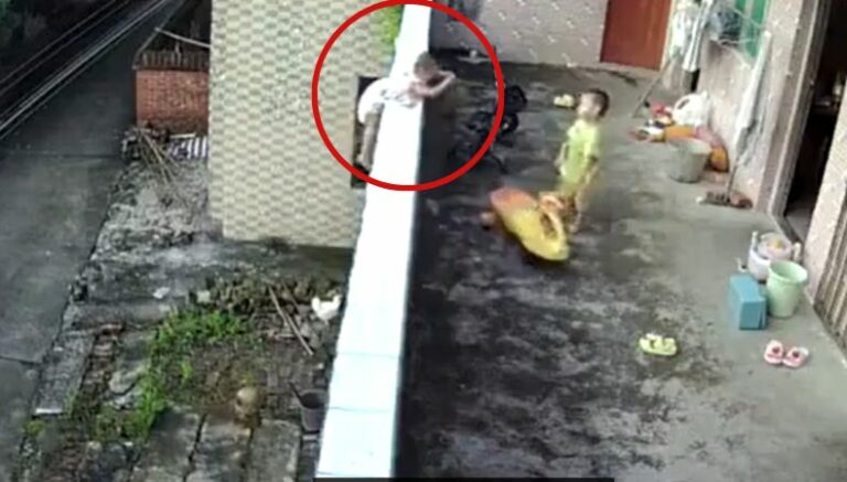 El clip, que tiene una duración aproximada de 34 segundos, filma a dos hermanos, de entre 2 y 4 años de edad, jugando en la pequeña terraza de una vivienda en China, sin la supervisión de un adulto. En la imagen, el más chico de los bebés aparece trepando la pequeña barda del balcón, mientras su hermano observa.
