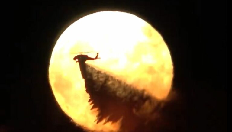 “La primera superluna de 2024 salió el lunes por la noche, proyectando un impactante telón de fondo para un helicóptero que luchaba contra el incendio de Quimby en San José”.
