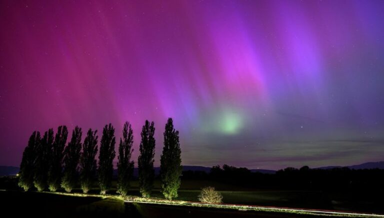 El cielo nocturno se iluminó de estas auroras boreales a consecuencia de una tormenta solar geomagnética, de acuerdo con el Centro de Predicción del Clima Espacial (SWPC).