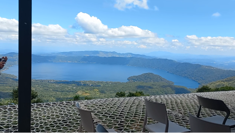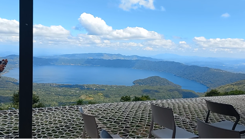 El lugar muestra una vista impresionante hacia el lago de Coatepeque y unas amplias instalaciones.