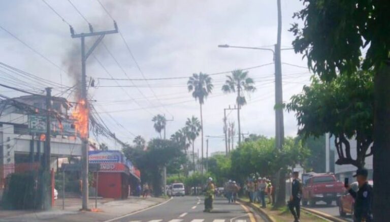 En información de última hora, se reportan un incendio en los cables del tendido eléctrico, en un tramo de la Alameda Manuel Enrique Araujo, a la altura de la incorporación a la plaza Divino Salvador del Mundo, en San Salvador.