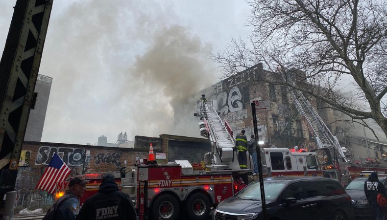 Según medios locales, el incendio se originó en un almacén de madera en el 304 de la calle Hewes, cerca de las vías del metro elevado que pasan por encima de Broadway.