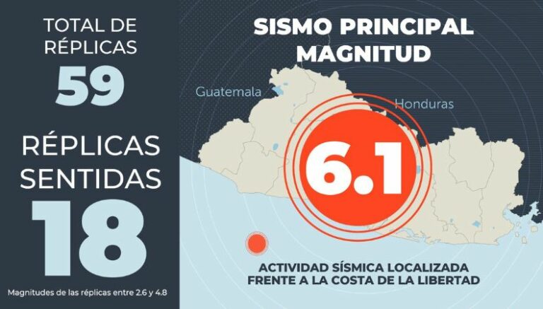 Por medio de la cuenta X, el MARN ha reportado, hasta las 6:00 a. m. de este día, un total de 59 réplicas frente a la costa de La Libertad, de las cuales, 18 han sido sentidas, con magnitudes entre 2.6 y 4.8. Cifra que muestra un aumento.