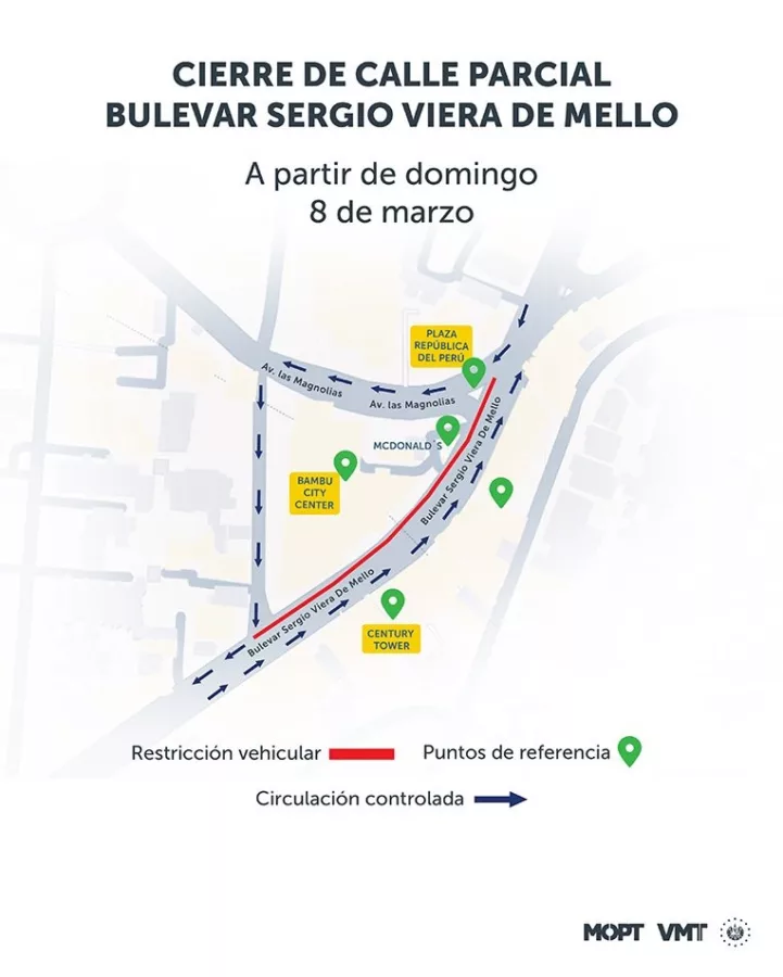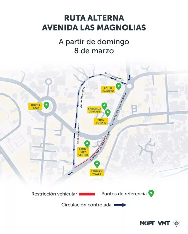 Además, gestores del VMT implementan un dispositivo de reorientación vehicular en el bulevar Sergio Viera de Mello, en San Benito. En ese punto, la circulación en sentido norte-sur está restringida, por lo que la ruta alterna habilitada es la avenida Las Magnolias.