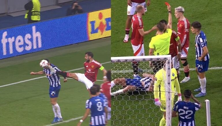 Al 81′, mientras los Red Devils avanzaban con el objetivo de igualar los cartones, Fernandes se ganó la segunda amarilla luego de intentar cazar un balón en el aire y elevar la pierna derecha con total imprudencia, casi conectando con la integridad del defensa Nehuén Pérez.
