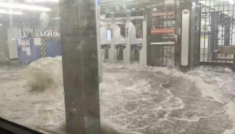 En Nueva York, un video en redes sociales mostró cómo un chorro de agua sucia y con lodo salió con fuerza frente a la entrada de una estación de metro.