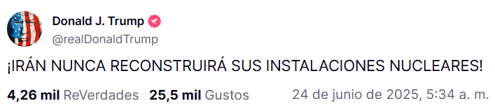 «Irán nunca se reconstruirá», declaró Trump a los periodistas en la Casa Blanca, antes de partir hacia la cumbre de la OTAN en los Países Bajos. El mandatario también replicó esa afirmación en una publicación en Truth Social.