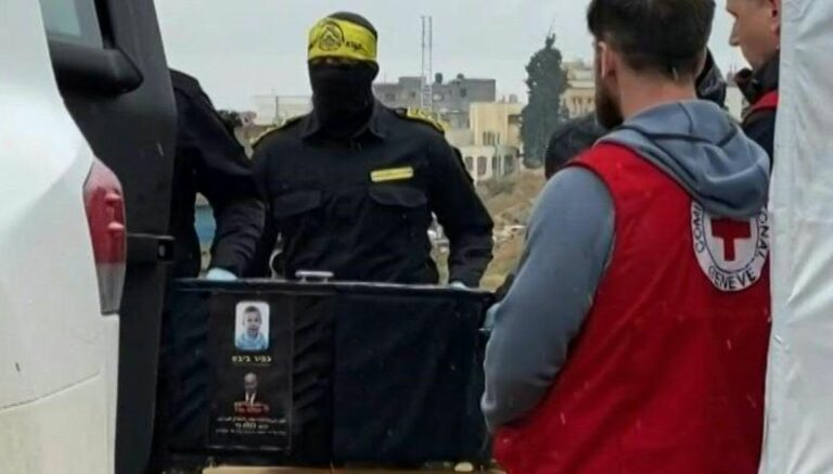 En horas de la mañana, Hamás entregó cuatro ataúdes negros al Comité Internacional de la Cruz Roja en Jan Yunis, en el sur de la Franja de Gaza. Después de que esta organización se los confió al ejército israelí.