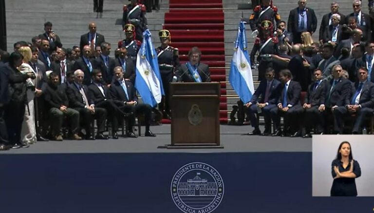 El presidente saliente, Alberto Fernández, entregó la banda presidencial, así como el bastón de mando, objeto que se convierte en un símbolo de mandato del país suramericano. Luego, el juramento lo tomó la vicepresidenta Villarruel, quien brindó unas breves palabras de agradecimiento a las personas.