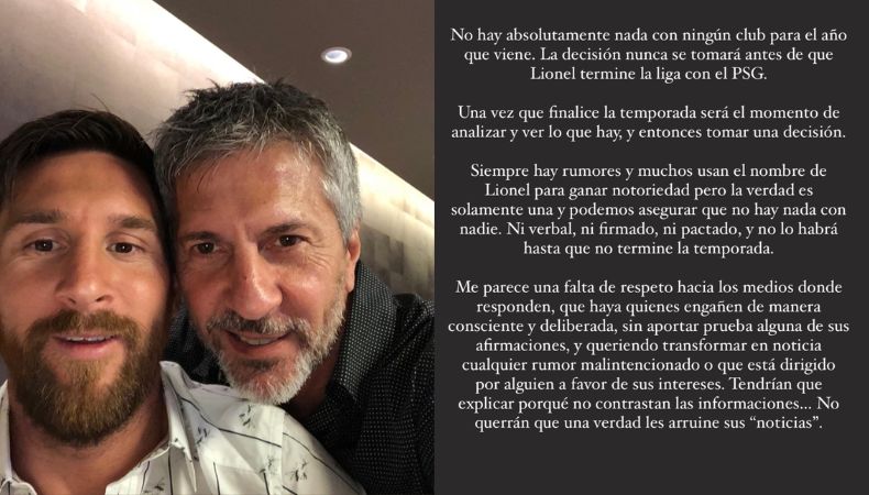 Por medio de un mensaje publicado en sus historias de Instagram, Jorge Messi habló sobre el futuro de su hijo, Leo, y expresó que no tiene nada acordado con ningún equipo.
